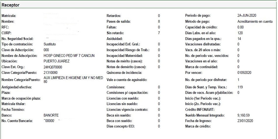 Segunda parte. Acá encontrarás las percepciones y deducciones que te aplican en la quincena. Conoce los conceptos. IMPORTE: Revisa los mensajes que ponen en cada quincena.